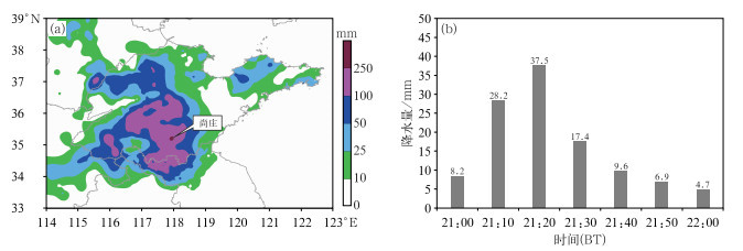 图 1 2023年7月(a)12日08:00至13日08:00累计降水量和(b)12日夜间费县尚庄站逐10 min降水量 Fig. 1 (a) Accumulated precipitation from 08:00 BT 12 to 08:00 BT 13 July and (b) 10 min precipitation on the night of 12 July at Shangzhuang Station in Feixian County in 2023 |