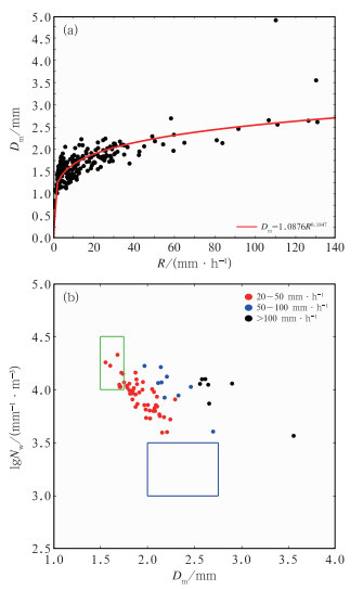 图 10 2023年7月12日19:00—23:00费县站雨滴谱观测仪(a)R-Dm和(b)Dm-lgNw分布 注:图a中红线为基于最小二乘法拟合的全体样本曲线;图b中绿框为海洋性分布区域,蓝框为大陆性分布区域(Bringi et al,2023)。 Fig. 10 Distribution of (a) R-Dm and (b) Dm-lgNw of the raindrop spectrum observation instrument at Feixian Station from 19:00 BT to 23:00 BT 12 July 2023 |
