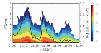 表 2 2023年7月12日21:00—22:00不同直径的粒子占比和对降水量的贡献率 Table 2 Contribution rates and frequency ratios of particles with different diameters to precipitation from 21:00 BT to 22:00 BT 12 July 2023 |