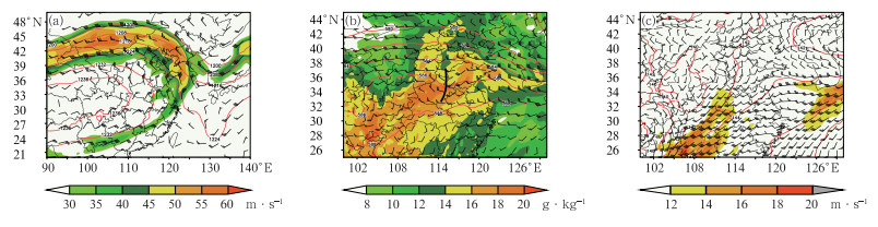 图 2 2023年7月12日08:00(a)200 hPa位势高度场(红色等值线,单位:dagpm)、高空急流(全风速≥30 m·s-1,填色)、风场(风羽),(b)500 hPa位势高度场(红色等值线,单位:dagpm)、风场(风羽)、850 hPa比湿(填色)和(c)850 hPa位势高度场(红色等值线,单位:dagpm)、风场(风羽)、低空急流(全风速≥12 m·s-1,填色) 注:图b中粗实线为槽线。 Fig. 2 (a) 200 hPa geopotential height field (red contour, unit: dagpm), high-level jet stream (total wind speed ≥ 30 m·s-1, colored) and wind field (barb), (b) 500 hPa geopotential height field (red contour, unit: dagpm), wind field (barb), 850 hPa specific humidity (colored) and (c) 850 hPa geopotential height field (red contour, unit: dagpm), wind field (barb), low-level jet stream (total wind speed ≥ 12 m·s-1, colored) at 08:00 BT 12 July 2023 |
