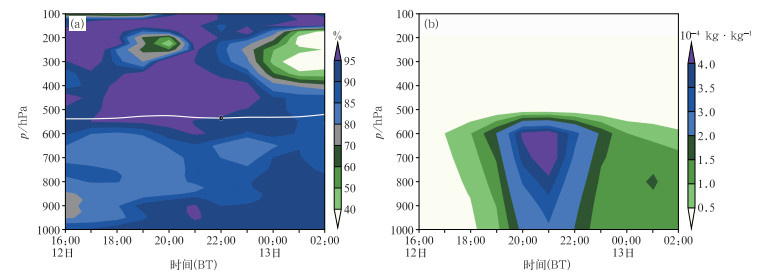 图 4 2023年7月12日16:00至13日02:00尚庄站(a)相对湿度、(b)液态水混合比含量的高度-时间演变 注:图a中白线为0℃层高度。 Fig. 4 Height-time evolution of (a) relative humidity and (b) liquid water mixing ratio content at Shangzhuang Station from 16:00 BT 12 to 02:00 BT 13 July 2023 |