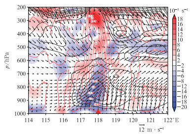 图 6 2023年7月12日21:00水平风场(风矢)、风速(黑色等值线,单位:m·s-1)、散度(填色) 和垂直速度(红色等值线,单位:Pa·s-1) Fig. 6 Horizontal wind field (vector), wind speed (black contour, unit: m·s-1), divergence (colored) and vertical velocity (red contour, unit: Pa·s-1) at 21:00 BT 12 July 2023 |