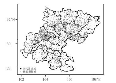 图 1 四川盆地地面观测站和天气雷达站分布 Fig. 1 Distribution of surface observation stations and weather radar sites in Sichuan Basin |
