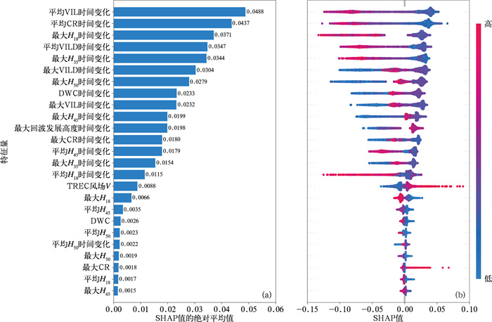图 11 无明显冷空气影响的雷暴大风预警因子的(a)重要性和(b)SHAP值排名 Fig. 11 (a) Importance and (b) SHAP value rankings of thunderstorm gale warning factors without strong cold air influence |
