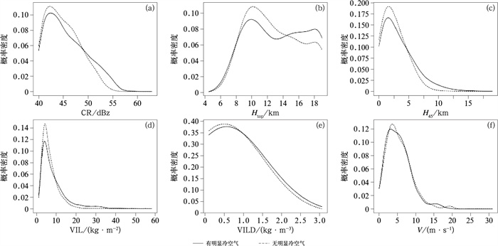 2.2 回波统计特征为了分析冷空气对雷暴大风回波特征的影响,按照地面有、无明显冷空气从四川广元或巴中达州一带进入盆地,将2018—2022年雷暴大风个例分为有明显冷空气影响和无明显冷空气影响两类,计算两类雷暴大风预警因子,绘制回波移动速度(V)、CR、回波顶高(Htop)、45 dBz回波发展高度(H45)、VIL和VILD共6个因子的概率密度曲线(图 3),可见在明显冷空气影响下,CR超过50 dBz、Htop超过14.2 km、H45超过6 km、VIL超过10 kg·m-2、VILD超过1 kg·m-3出现的概率高于无冷空气影响个例,回波移动速度则无明显差异。