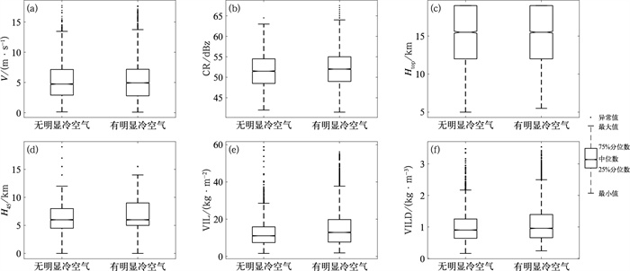 从箱线图(图 4)的分布来看,明显冷空气影响时,CR、VIL、VILD的第50%、75%分位数和最大值均较高,其中VIL高出的幅度最大。对比可见,有明显冷空气参与的雷暴大风的回波更强、发展高度更高,对流发展更加剧烈。