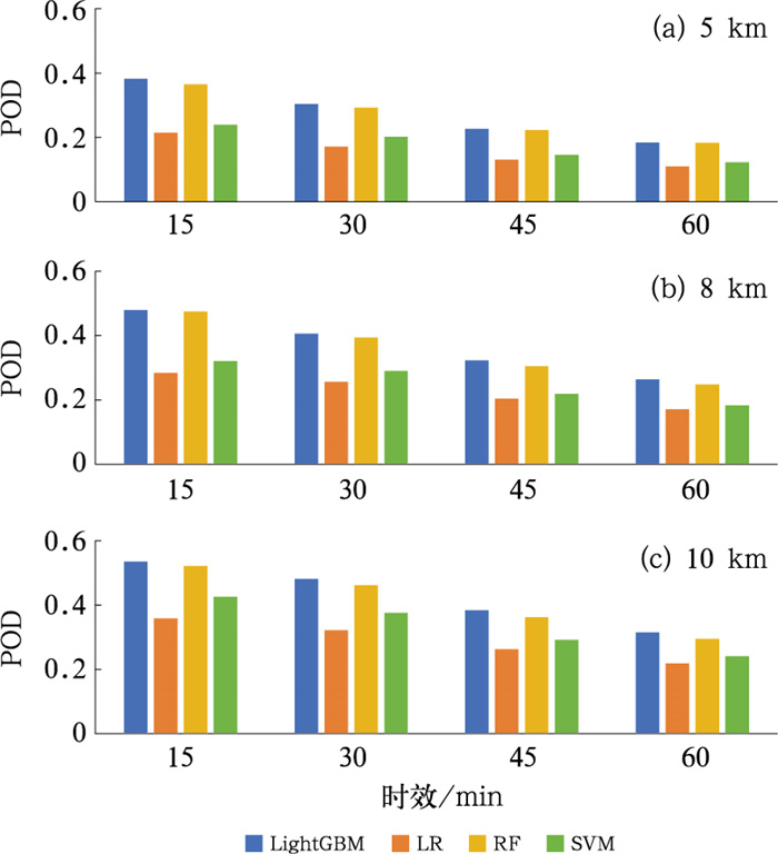 (1) LightGBM模型的POD最高,15 min预警时效下,10 km半径达0.536,表明其捕捉能力最强,但FAR也最高,达0.661,RF的CSI最高,30 min预警时效下,10 km半径达0.306,综合表现最佳。在不同评分半径和预警时效下,CSI和POD评分均随预警时效增加或评分半径减小而显著降低,时效从30 min延至45 min时CSI下降尤为明显。