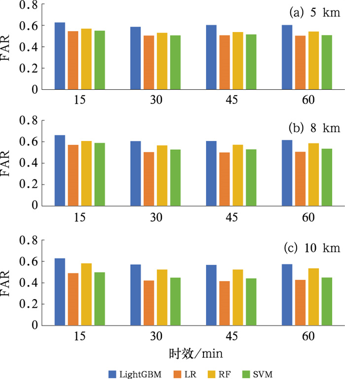 为评估雷暴大风预警模型的时效性,选取2023年符合“超过2个市出现较集中雷暴大风且持续时间超过4 h”标准的8次过程进行检验。检验基于未来15、30、45、60 min内出现的雷暴大风实况,并分别设置了5、8、10 km共3种评分半径。4种模型均在10 km评分半径、15 min预警时效下获得最高CSI评分,CSI评分随着评分半径的减小或预警时效的增加而降低,预警时效从30 min延长至45 min时,CSI下降尤为显著,在8 km和10 km评分半径下,15 min与30 min预警时效的CSI评分非常接近。整体上,RF模型的CSI评分表现最优,在10 km半径、30 min时效下达到最高值0.306,LightGBM次之(图 6)。4种模型同样在10 km评分半径、15 min预警时效下取得最高POD评分,POD评分也随着评分半径减小或预警时效增加而下降,在不同评分半径和预警时效下,LightGBM的POD评分均最高,RF次之,在15 min时效下,LightGBM的POD在5、8、10 km半径下分别高达0.381、0.479和0.536(图 7)。4种模型的FAR整体维持在0.5~0.6,在不同评分半径和预警时效下,LightGBM的FAR始终最高(尤其在15 min时效下达0.661),RF次之(图 8)。模型对比显示,LightGBM拥有最高的POD(捕捉能力最强)和最高的FAR(虚警最多);RF则拥有最高的CSI(综合表现最佳); 无论是CSI还是POD评分,均随着预警时效的增加或评分半径的减小而降低。