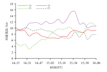 对每个对流体逐个时刻提取雷达CR、液态水含量、回波顶高最大值,绘制相应的时序曲线(图 9~ 图 11)。由图 9可知,4个对流体的CR没有明显区别,在发展旺盛期其CR都达到55 dBz以上。图 10、图 11显示T1的液态水含量、回波顶高比其他3个对流体大,其中回波顶高平均值达11.63 km,最大值接近15.3 km,回波顶高和霰粒子层厚度相同,都在15:30左右开始大幅跃增,15:40左右达到峰值;T2、F1、F2在液态水含量、回波顶高上差异较弱,回波顶高维持在8 km左右(平均值为8.095 km)。而在霰粒子层厚度的时序分布特征上,T1、T2的数值都比较高,平均值分别为2.75 km、1.87 km,最大值分别为5.92 km、3.5 km,而F1、F2平均值分别为1.54 km、1.34 km,最大值分别为1.98 km、1.81 km。对4个对流体的霰粒子层厚度计算差分值(即相邻时刻的变化值),可得T1、T2、F1、F2中差分值大于0 km的时刻占比,分别为63%、67%、62%、47%,有地闪发生的对流体更多时刻的霰粒子层厚度不断增大,且在首次地闪发生前几个时刻,T1、T2霰粒子层厚度变化率都处于增加的状态。因此,在本次个例中,相比于其他常见的雷达产品,霰粒子层厚度在对地闪活动的表征上更具有显著性。