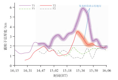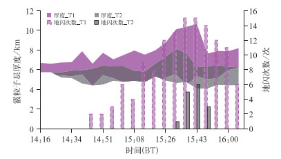 T1、T2霰粒子层厚度与地闪次数对比如图 12所示,霰粒子层厚度与地闪次数呈现出一定的相关性;T1大部分时段霰粒子层厚度都大于T2的厚度,T1从14:48开始持续出现地闪活动,而T2只在15:30之后的24 min内有地闪活动,且地闪的次数也比T1少;当霰粒子层厚度达到峰值后转为下降时,地闪过程仍在持续。这可能是由于对流体内积累的电荷量与电场仍足以维持地闪活动,因此出现霰粒子层厚度降低、地闪却持续的现象;随着霰粒子层厚度进一步减少,地闪活动逐渐减弱并最终消失。