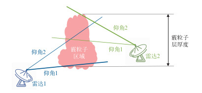 1.3 霰粒子层厚度计算方法对流体出现霰粒子的最低仰角处的高度记为h1,存在霰粒子的最高仰角处的高度记为h2,则h1~h2表示对流体个例霰粒子层的厚度。由于双偏振雷达HCL的霰粒子产品为径向数据格式,而霰粒子层厚度计算的是竖直距离,因此需要在同一个经纬度位置分析不同仰角的霰粒子分布情况,然后对霰粒子层厚度进行计算。受探测角度限制、遮挡等因素影响,单独一部雷达对霰粒子层厚度的计算可能存在较大偏差,最佳的计算结果是将雷达1的角度1与雷达2的角度2融合(图 2),因此实际霰粒子层厚度计算由对流体范围内多部雷达的综合数据计算获得,具体计算方法是对每个时刻遍历每个雷达的所有仰角,将对流体所在位置所有出现霰粒子仰角对应的高度存放在一个列表中,最后计算列表中最大值与最小值的差值,即为多部雷达综合计算得到的对流体霰粒子层厚度,其中霰粒子高度采用雷达仰角进行计算。