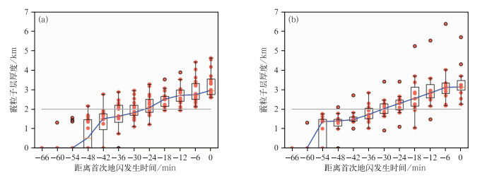 对所有对流体个例在首次地闪发生时刻前66 min内的霰粒子层厚度进行统计,根据福建省闪电天气的背景特征,将样本分成夏季副热带高压(以下简称副高)或副高边缘型、冷暖切变线及槽活动型进行分析,按个例遴选的天气分型标准绘制箱线、中位数折线图(图 5),由图 5可知,冷暖切变线与槽活动型的地闪初生需要更长的电荷积累时间,霰粒子层出现与增厚的时间比副高或副高边缘型多1~2个体扫时刻,地闪初生时霰粒子层厚度比副高或副高边缘型略大、分散,而副高或副高边缘型的地闪初生前则不需要更长的时间积累,地闪初生速度比较快,有些个例开始就出现两个仰角观察到霰粒子且厚度突破2 km,只经过3~4个雷达时次即快速出现首次地闪,同时样本个例的数据偏差比较小。此外,冷暖切变线类型比较容易出现分散的霰粒子,副高边缘型容易出现成片的霰粒子分布,这可能与对流体的动力、热力、水汽等背景的强弱有关。但不管是哪种天气分型,霰粒子层厚度的时序特征与对流体是否有地闪发生的关系都相同,不同天气分型对地闪初生预报指标没有明显影响。