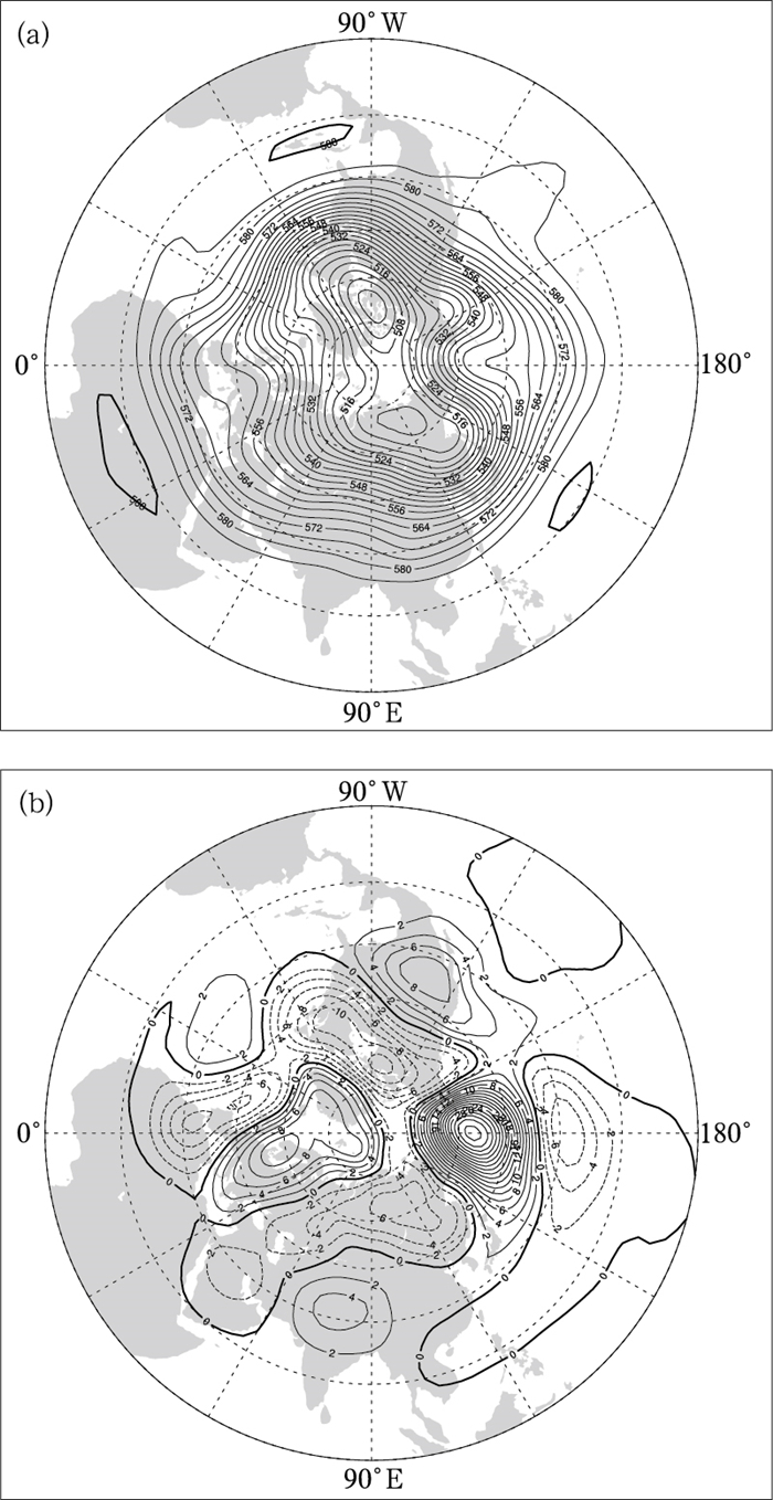 图 4 2025年12月北半球500 hPa(a)平均位势高度场和(b)距平场(单位:dagpm) Fig. 4 (a) Monthly average geopotential height and (b) its anomaly (unit: dagpm) at 500 hPa in the Northern Hemisphere in December 2025 |