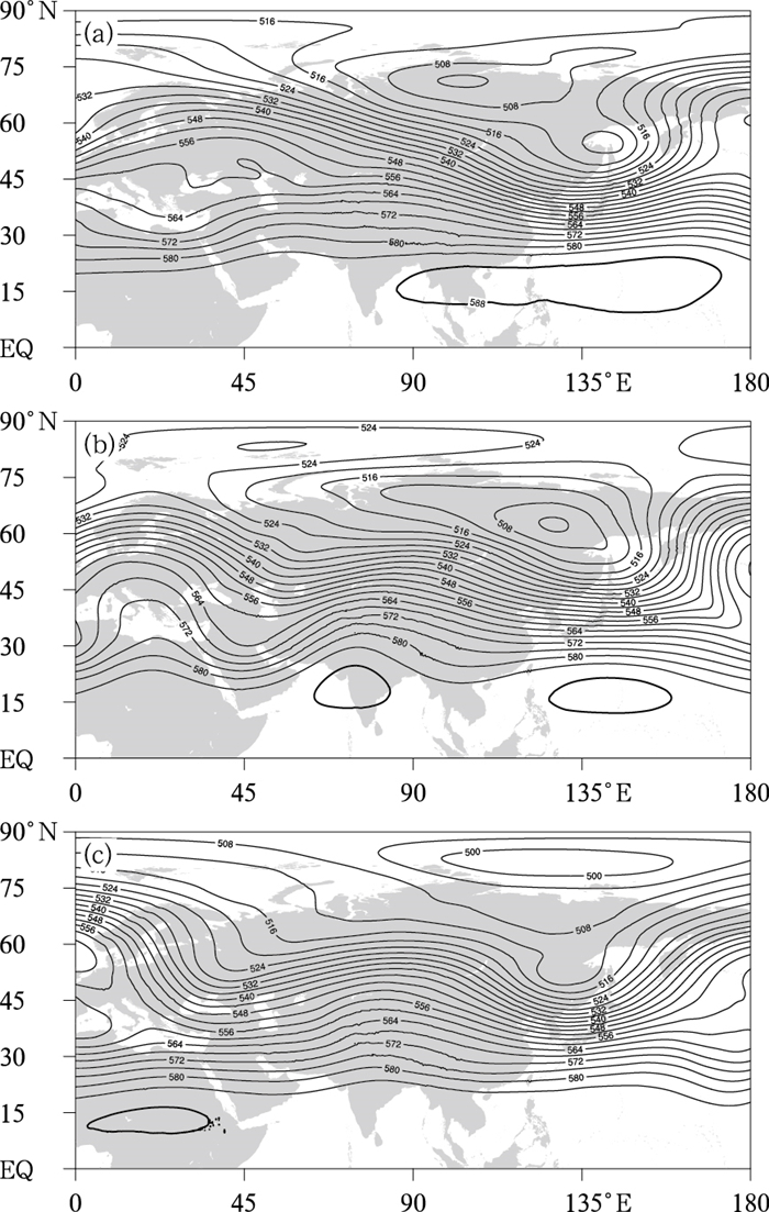 图 5 2025年12月(a)上旬、(b)中旬、(c)下旬欧亚500 hPa平均位势高度(单位:dagpm) Fig. 5 Average geopotential height (unit: dagpm)at 500 hPa over Eurasia in the (a) first, (b) second and (c) third dekads of December 2025 |