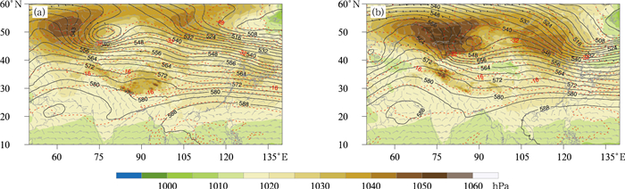 图 7 2025年12月(a)10日08时和(b)11日08时500 hPa位势高度(黑线,单位:dagpm)和温度(红线,单位:℃),850 hPa风场(风羽)及海平面气压(填色) Fig. 7 500 hPa geopotential height (black line, unit: dagpm) and temperature (red line, unit: ℃), 850 hPa wind (barb) and sea level pressure (colored) at (a) 08:00 BT 10 and (b) 08:00 BT 11 December 2025 |