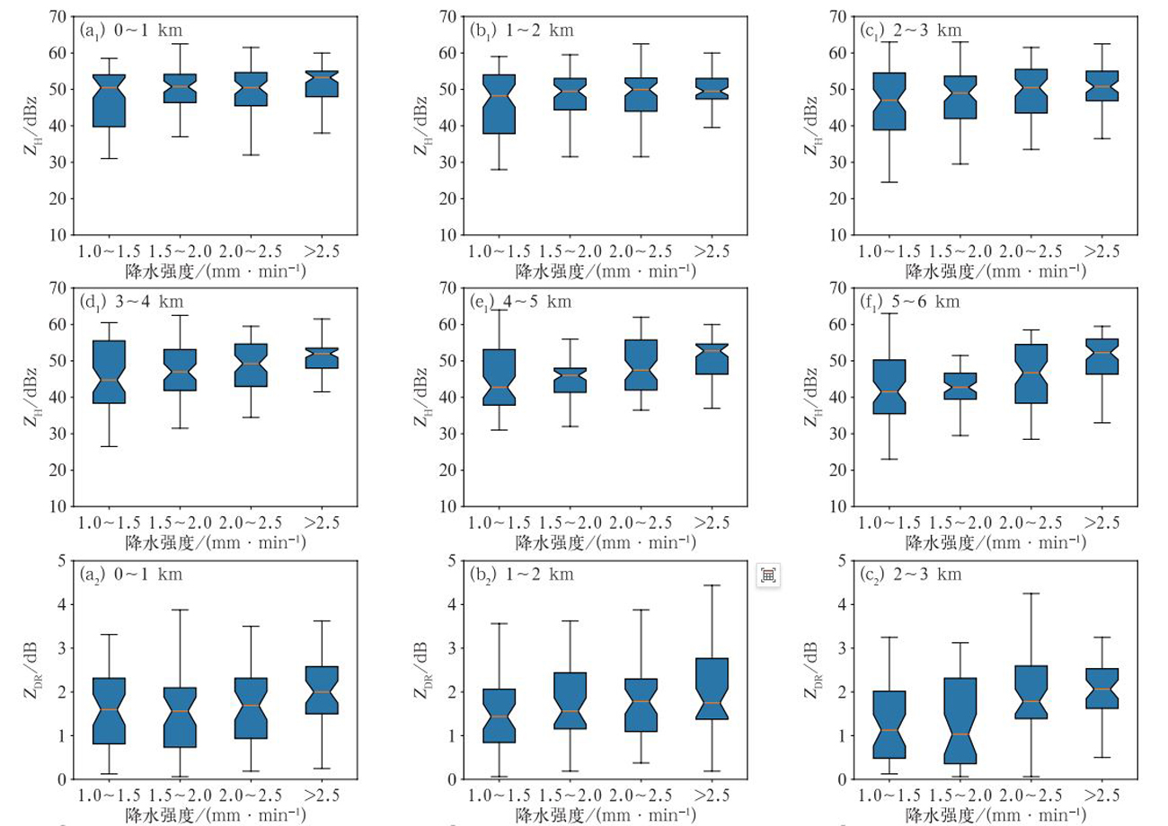 为探索X波段相控阵雷达对极端降水的探测能力,基于2023—2024年6—8月(夏季)X波段相控阵雷达基本产品及三维反演风场,采用统计和诊断分析方法,对两年夏季9次极端降水事件的双偏振参量特征和其中3次典型过程的风暴结构进行研究。结果表明:随着分钟降水强度增大,4 km以下水平极化反射率因子(ZH)、差分反射率因子(ZDR)和差分传播相移率(KDP)的平均值和中位数逐渐增大,KDP增长最明显,>2.5 mm·min-1的超强降水的KDP在各高度上较1~1.5 mm·min-1和2~2.5 mm·min-1分别增长30%~246%、15%~167%。ZH和KDP在0~1 km最大,随高度升高而减小。分钟降水极值前3~10 min,低层双偏振参量逐渐增大,极值后2~5 min逐渐减小,KDP波动幅度最大,2 km以下极值前涨幅133%~205%,极值后跌幅49%~55%。分钟降水强度主要取决于KDP,即粒子浓度。分析极端降水风暴特征可知:风暴为后向传播型,西侧每4~6 min新生一个单体,风暴全生命史≥65 min。风暴内存在4~5 km厚的气流辐合区。ZDR大值中心低于3 km,较大雨滴集中在低层。KDP增大滞后于ZDR增大,可能原因为雨滴在下降过程中先增大后破碎,形成高浓度小雨滴。