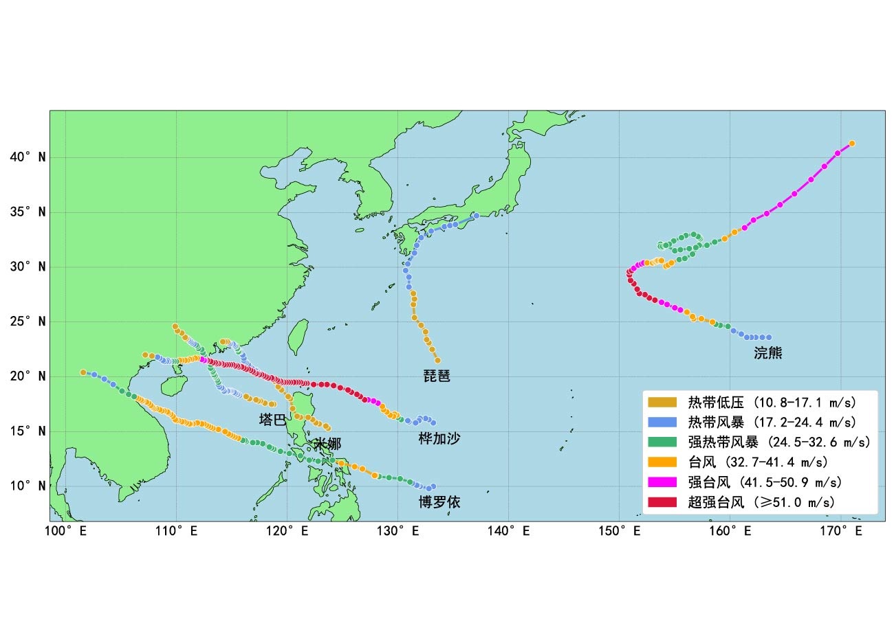 利用1949—2024年中国气象局台风最佳路径资料、2024年中央气象台台风路径和强度实时业务资料、欧洲中期天气预报中心ERA5再分析资料等,对2024年西北太平洋和南海台风活动的主要特征进行分析。结果表明:2024年台风生成数和生命史平均极值强度均接近气候平均,生成源地偏北、偏西;登陆个数偏多,强度偏强,登陆地段集中;秋季台风活跃;台风深入内陆,造成大范围强降水。中央气象台主观路径预报整体上优于日本和美国;台风强度预报误差大于日本,但小于美国。业务预报中的重要难点问题包括:由于模式对台风登陆后的复杂结构变化及其所受的引导气流影响难以把握,导致路径预报产生较大误差,对此类过程的订正较为困难;台风残涡的陆上维持预报及其降水影响的预报;台风“摩羯”的快速增强及超强台风长时间维持预报等。